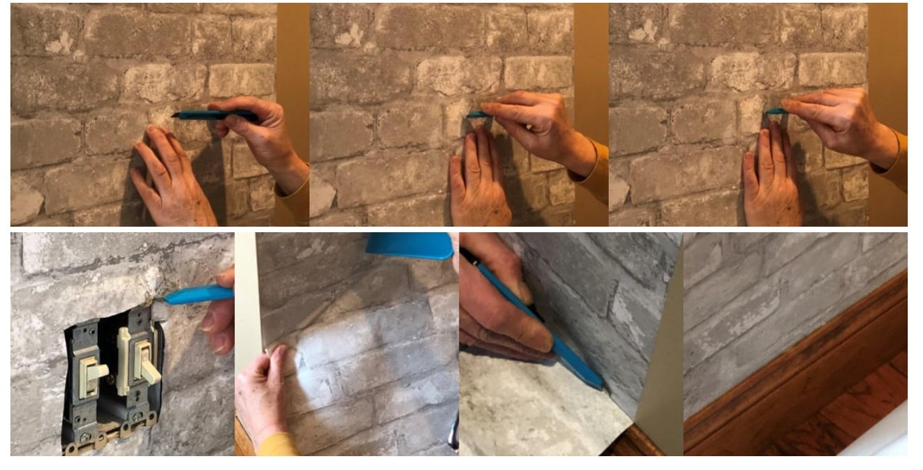 Continue working down the wall peeling the backing down, sticking the wallpaper to the wall and smoothing with the smoothing tool, if you have any switches apply the wallpaper over them then using the utility knife start by cutting a small square in the center around the switch and remove keep trimming around the switch until you get near the outside of the plate then smooth the wallpaper and continue down the wall. When you reach the bottom of the wall use the smoothing tool to make sure the wallpaper is nice and tight to the baseboard then using the utility knife cut the wallpaper as close as you can to the baseboard next using the utility knife trim off the excess wallpaper at the top of the wall as close to the ceiling as you can get.