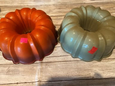 The first thing you need to do is wash your bundt pans to make sure they are clean, next in a well ventilated area spray paint your bundt pans, I used Rust-Oleum spray paint in the color rustic orange and it took two coats. After you have given the bundt pans two coats of paint and they have dried using a piece of fine grit sandpaper sand off the paint on the raised edges until the silver of the pan shows through.