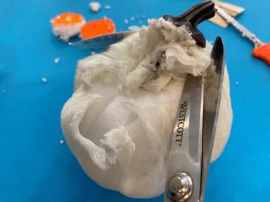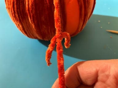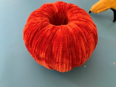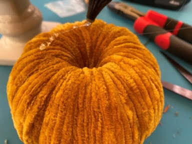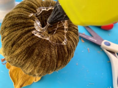 When you have finished wrapping your pumpkin make sure you end up with the end of your yarn at the top. If you still have yarn left on your skewer cut the yarn making sure you leave enough to glue down in the hole. Now add a dap of hot glue on one side down in the hole in the top of the pumpkin then glue your end of the yarn down into the hole.