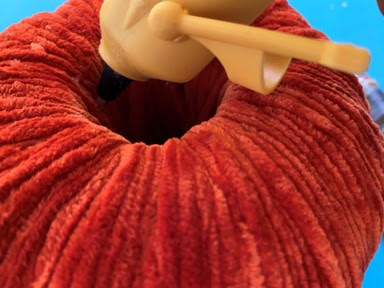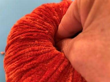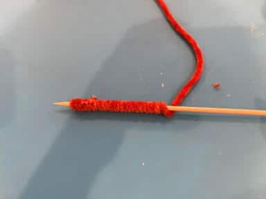 Take a skewer and the yarn you are using for the larger pumpkin which will be the bottom pumpkin and start wrapping your yarn around the meat skewer going up and down the skewer. I did not measure how much I used I just keep wrapping until it started to get to thick. Don’t worry if it is not enough to cover the pumpkin we can wrap another and tie it to the pumpkin on the yarn.