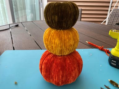 The first thing you are going to do is remove the stems and fabric from the pumpkins. Using a pumpkin carving knife or a regular knife cut a hole in the top of the orange foam pumpkin. You want the hole to be at least the size of a half dollar if not a little bigger. Then cut a hole in the bottom of the pumpkin. Don’t worry if the hole is a little to big it is going to be covered by the second pumpkin. Repeat this step to the second pumpkin which is the one that was covered with the fabric. Now you are going to cut a hole in the top and bottom of the small pumpkin. Try not to make these holes to big but you need them to be big enough for the yarn you are going to be wrapping through and the hole will get smaller as you wrap the yarn. Sorry I forgot to take photos of the small pumpkin.