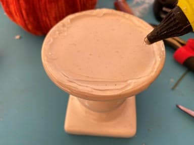 To assemble the topiary add hot glue around the edge of the top of the candlestick and glue on the larger bottom pumpkin. Next add hot glue to the bottom of the middle pumpkin where it will be touching the large pumpkin then glue the pumpkin to the bottom pumpkin. For the last pumpkin add glue to the bottom of the pumpkin around the hole and glue to the top of the second pumpkin.
