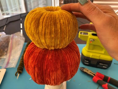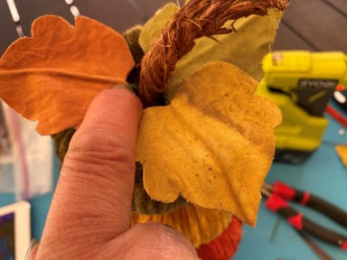 To add the stem to your topiary add hot glue down the middle of the hole on your top pumpkin then glue in your stem. You can use the stem that came with the fabric covered pumpkin or you can make your own like I do. If you would like to make the pumpkin stem go to my blog on how to make a pumpkin stem. To add the leaves add a little hot glue to the floral wire then stick down into the pumpkin around the stem. Repeat this steps for each leaf you want to add.