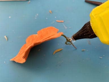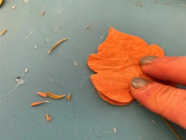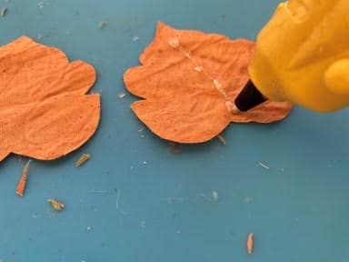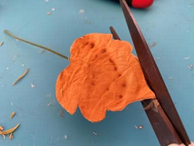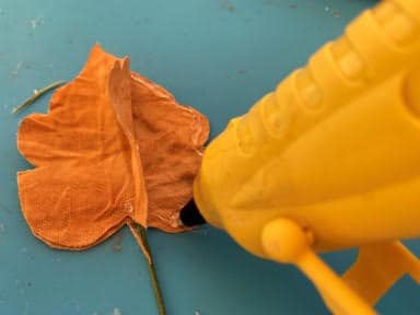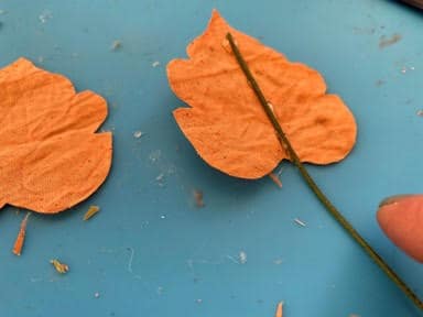 Lay down one leaf add a line of hot glue down the middle, lay your floral wire on top of the glue. Add a little more hot glue on top of the wire then glue the second leaf on top gluing it down. Fold back one side of the leaf add hot glue around the edge then glue the two leaves together. Repeat this step to the other side of the leaf. Trim any uneven ends of the leaf. Next cut your floral wire you just need enough wire at the bottom of the leaf to glue and stick into the top of the pumpkin. Repeat these steps to each leaf you would like to make.