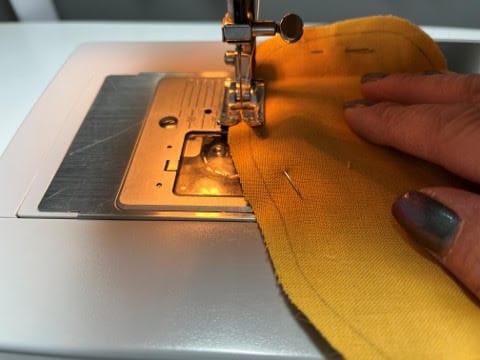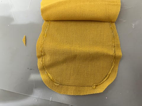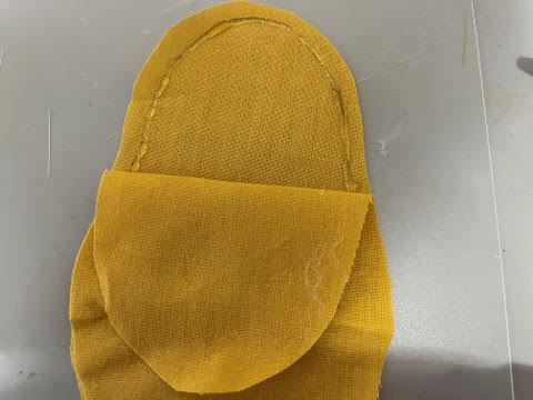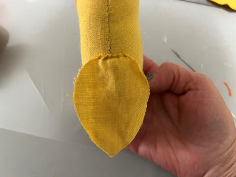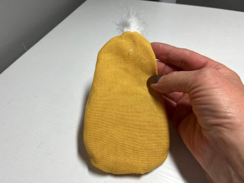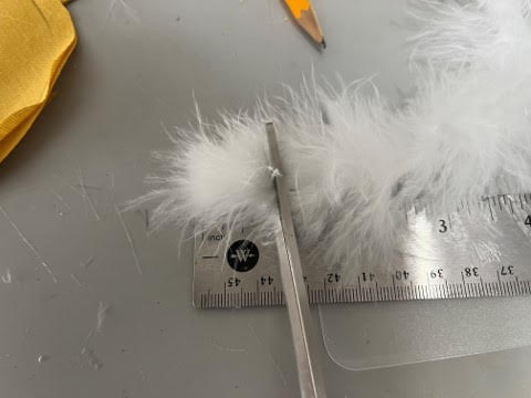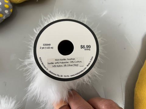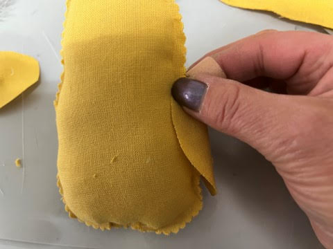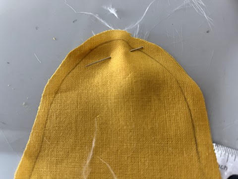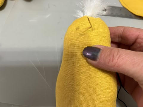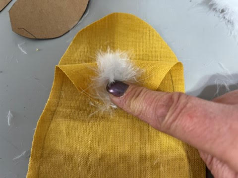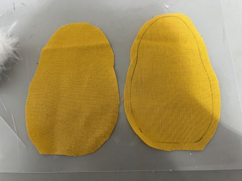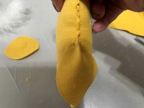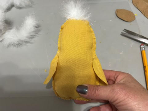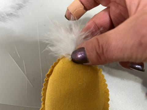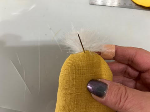 To sew your chick start by cutting a 1” piece of boa trim place between your two pieces of fabric at the top of the head in the middle where indicated in the pattern. Make sure the end of the piece of boa is above your trace line. Pin the boa in place using a sewing pin then pin your two pieces of fabric together. Sew your chick body on the sewing machine using the trace line as the sew line and make sure you leave the opening at the bottom of the chick where indicated on the pattern.