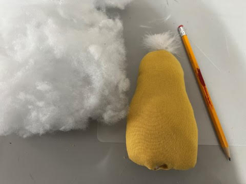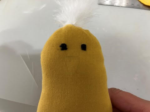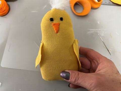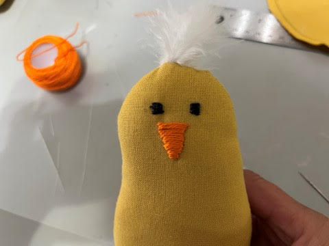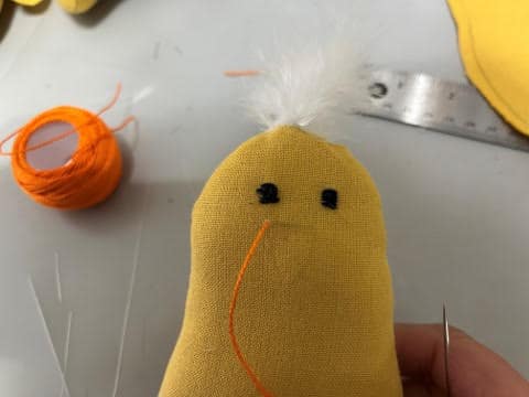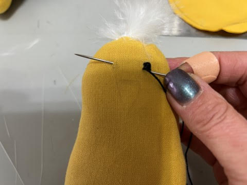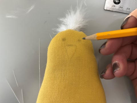 Using a pencil lightly draw on the chicks eyes and beak. For the eyes you will be using 3 strands of black embroidery thread and a needle. Insert the needle through the back of the head to the front at the top of one eye pulling your knot through the back of the fabric. Stitch the eye, when you are on your last stitch bring the needle under the fabric and up through the top of the other eye. Stitch on the second eye, when you are on the last stitch bring your needle up to the back of the head at the top knot and trim of excess.