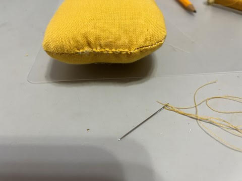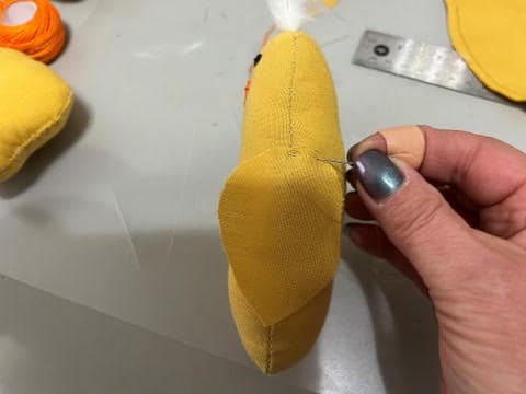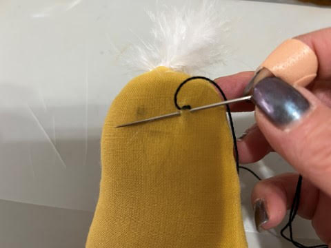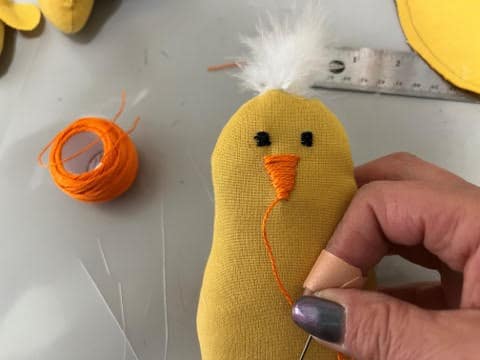 For the beak you will be using 3 strands of orange embroidery thread and a needle. Insert the needle through the back of the head coming out the front at the top of one side of the beak. Stitch on your beak, when you are on the last stitch bring the needle up to the top back of the head knot and trim off excess.