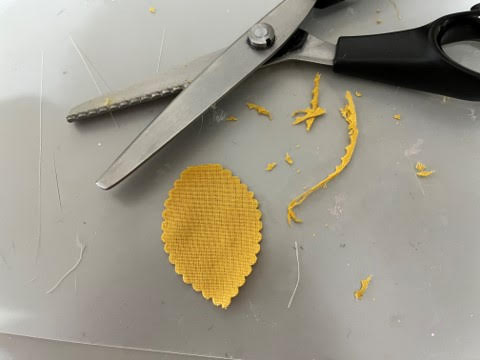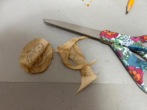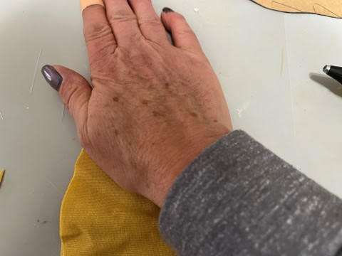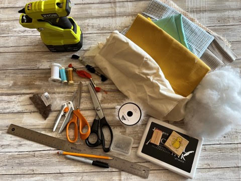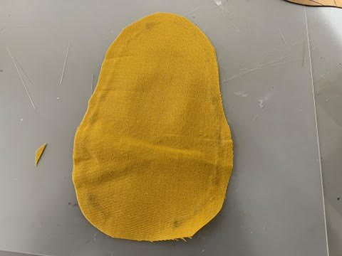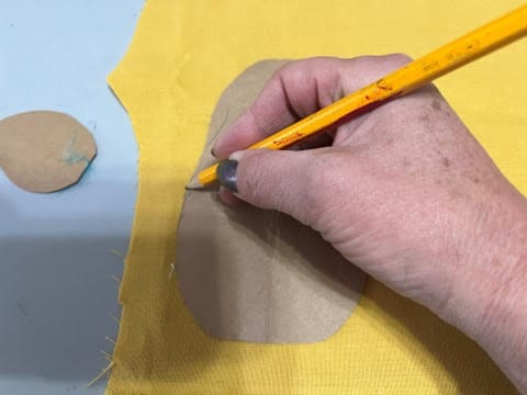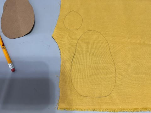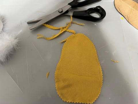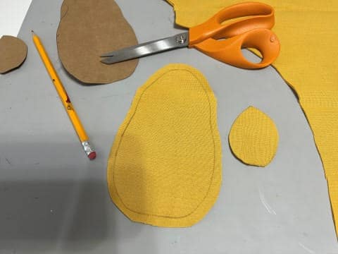 The first thing you will need to do is print and cut out the fabric chick ornie pattern. Trace the chick body on a double layer of fabric then cut out about a ¼” away from the trace line, if you are using a printed fabric face the print side inwards and trace on the back of the fabric. Trace the wings on a double layer of fabric then using pinking shears cut out on the trace line, set the wings aside for now.