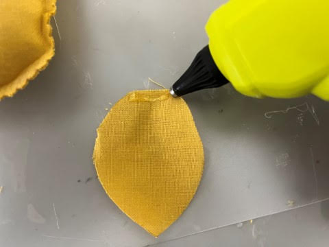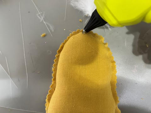 To glue your chick body after tracing and cutting out your body and wings as instructed at the beginning of this blog, separate your two body pieces then place the body piece with your trace line on top of the second piece of the body. Fold down the top piece of fabric about half way add a line of hot glue onto the trace line then glue down the top piece. Next fold up the bottom of the top piece add a line of hot glue onto the trace line making sure you leave an opening at the bottom where indicated on the pattern, glue down the top piece of fabric.