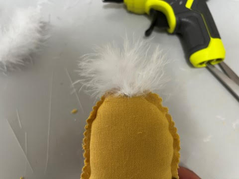 Using pinking shears trim around your chick body but not to close to the glue line. Stuff with your fiberfill then glue the opening closed. After your chick is stuffed your may want to trim around the chick body again. Next cute about a 1” piece of the boa trim add a little hot glue to the top of the chicks head in the middle where indicated on the pattern then glue the boa in place.