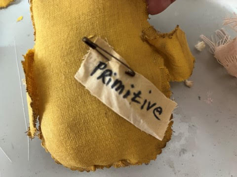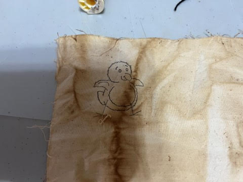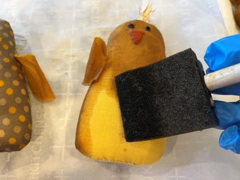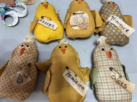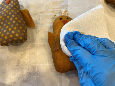 If you would like a primitive look you can coffee stain your chicks. I have a recipe for a coffee stain mixture in my blog titled how I color and coffee stain fabric. Wearing a pair of rubber gloves and using a sponge brush cover your chick with the coffee stain mixture. I did not want my chicks to dark so I blotted them with paper towel to remove some of the coffee. Place your chicks on a parchment lined cookie sheet then you can let them dry naturally or you can place them in a 225 degree oven to dry making sure you check them every 5 minutes or so until dry. If you have hot glued your chicks you can NOT put them in the oven you will need to let them dry naturally. You will also want to coffee stain a piece of muslin at this time for the tags.