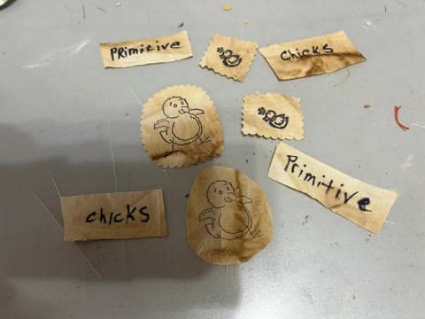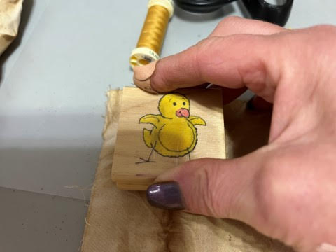 I coffee stained my muslin to make the tags but you do not have to coffee stain the muslin. You can use stampers and a ink pad or just a black sharpie to make your tags. I used two cute little chick stampers I had and a black sharpie to write my words. After either stamping or writing on your muslin cut them out then pin each one to a chick using 1” rusty safety pins. Using rusty safety pins is optional you can use a regular safety pin also. If you are looking for rusty safety pins I sell them in my online store.