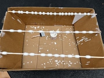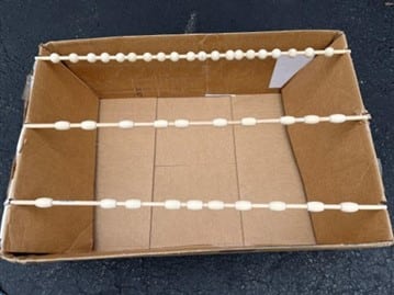 Time to stain the wood beads! You are going to need to stain 20 oval wood beads and 16 round wood beads. I found the easiest way to stain them was to slid them onto a long 3/8 dowel get a cardboard box and make notches on two sides of the box to lay the dowels in then stain the beads.