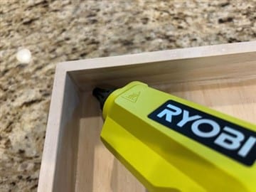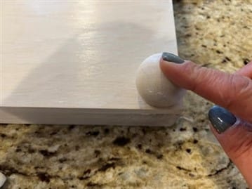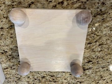 You are going to glue on the feet next. Take one of the box signs place down with the flat side facing up. Add the gorilla adhesive to the center of one 1.5” wood ball knob then add hot glue around the adhesive. Glue on the ball knob in one of the corners of the box sign. Repeat these steps to the other 3 ball knobs placing one in each corner of the box sign. This is the bottom of your lantern.