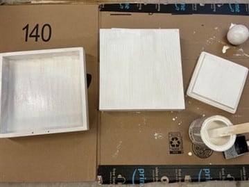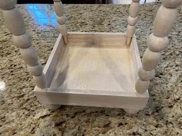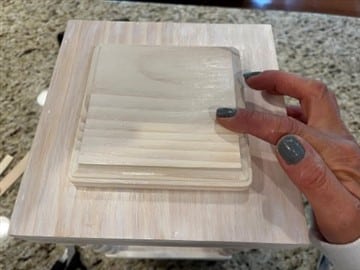 The first thing you will need to do is remove the stickers from the 2 wood box signs then fill in the nail holes with either wood putty or spackling. Next give the 2 wood box signs and the 5”x5” square wood pieces a sanding. You are going to stain all sides of the two wood box signs including the underneath. You only need to stain the top and sides of the 5”x5” square wood piece. If you are using the wood stain that I have used follow the directions on the can. The longer you leave the stain on the whiter you pieces will be. Wipe the stain off with a lint free rag.