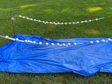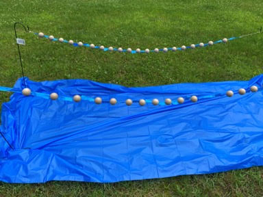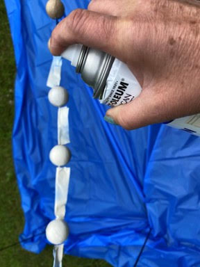 The easiest way I found to paint the paper mache garland was to cover the jute twine in-between each ball with painters tape. I took the garland outside laid a plastic table cloth out in the yard then I used two plant hooks from the Dollar Tree stuck them in the ground and hung the garland on them. You can take the balls off the twine and paint each one individually if you would like but I found this really simple. Paint the balls with two coats of the rust-oleum heirloom white paint making sure you get all the balls covered and letting dry in-between coats.
