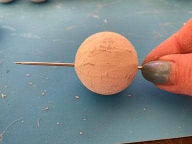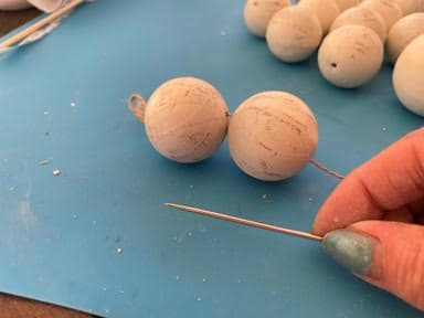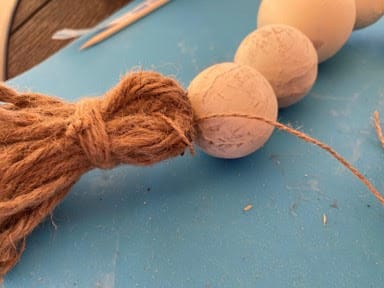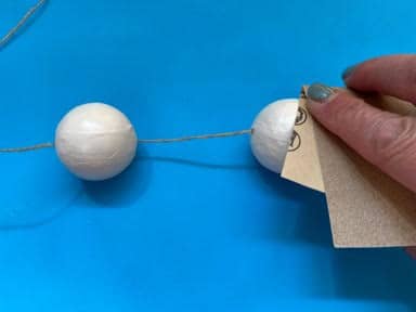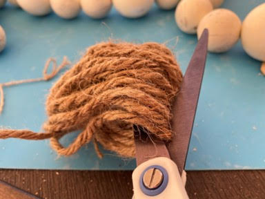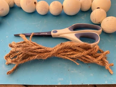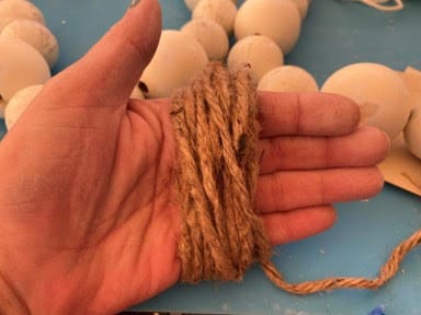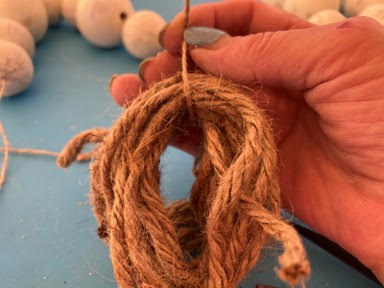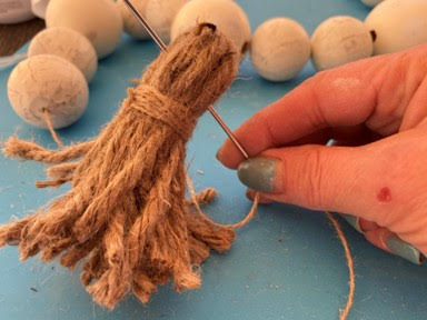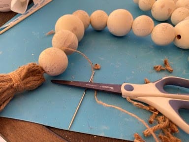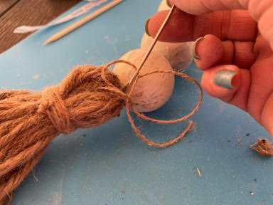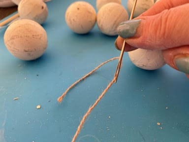 Thread your jute twine from your garland through a large eye needle. Now you are going to start adding the balls. Start by putting the needle with the jute twine through the holes of a paper mache ball. Slide the ball down towards the end of the twine you want to leave about 12” of twine at the end. Next add another paper mache ball then a wood bead, slid them down to the first paper mache ball. Continue adding the paper mache balls and wood beads in this order to the garland until you have all 20 paper mache balls and 9 wood beads on the garland.