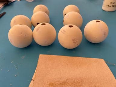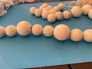 Once your beads and garland are dry remove the painters tape from the garland. Remove the paper mache balls from the garland. Using 220 grit sandpaper sand all the paper mache balls and wood beads to give them a worn chippy look.