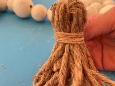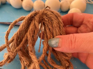 Next fold the gathered jute twine in half with your twin knot facing the inside. Take a 24” piece of the thinner twine and holding one end of the twine with your start wrapping the twine around the folded jute about an inch from the top. You want to end where the end you were holding down is then tie a double knot. Trim off excess. Next trim the bottom of the tassel so it is somewhat even. Thread the one end of your garland with the needle then feed the needle and jute through the middle of the opening of the tassel then pull the tassel tight to the paper mache ball and tie a double knot, trim off excess. Repeat the above steps to make and attach another tassel to the other end of the garland.