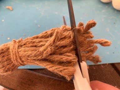 Starting with the end of the 4ply jute facing downwards in the palm of your hand wrap the jute twine around you hand 20 times then cut making sure your second end of twine is also facing down. Carefully slide off your hand but still hold it so it doesn’t fall apart next take a 6” piece of the thin twine slid it under and through the top of your wrapped twine then tie a double knot. Trim off excess. Pull down on the bottom of the wrapped twine and cut in the middle. You now should have a straight piece with your thinner tied jute in the center.