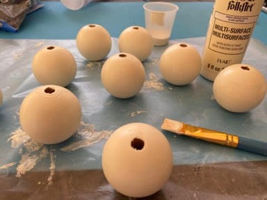 While your garland is drying you can paint your wood beads. Paint nine wood 2” wood beads with Waverly white chalk paint. You can do one or two coats that is up to you. Let dry then paint them two coats of the vintage white craft paint, letting dry in-between coats.