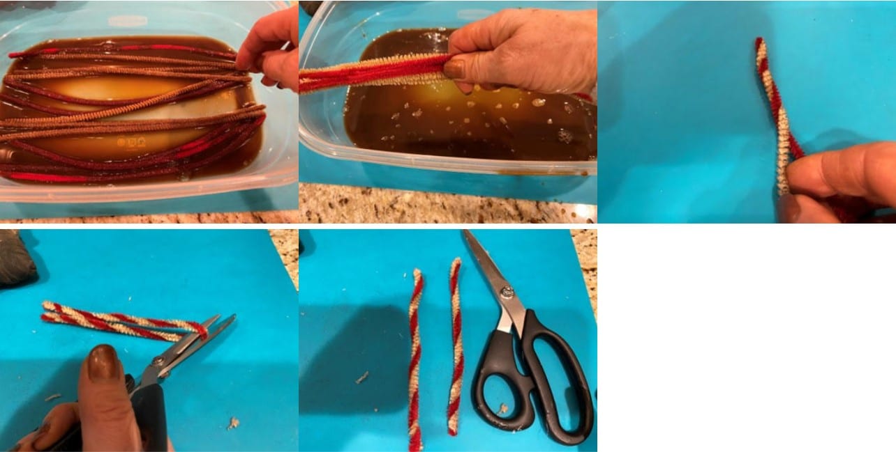 To make the candy canes take red and white chenille pipe cleaners dip them into the coffee stain mixture then pull through your fingers to remove excess coffee and let dry. I like to dry mine in the oven it seems to give them an older look then allowing them to dry on their own. Once the pipe cleaners have dried take one red and one white and twist them together then bend in half and cut next take each piece and form into a candy cane.