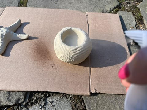 The first step is to paint all sides of the starfish and tealight holder with a cream colored chalk paint, let dry. Paint a second coat on the pieces and let dry. Next outside or in a well ventilated area spray all sides of your starfish and tea light holder with a sealer, I like to use Rust-Oleum clear matt or matt dead flat sealer. Let your pieces dry.