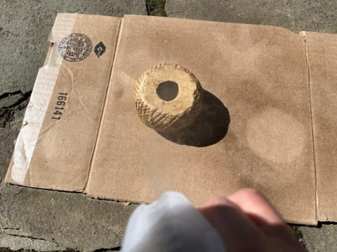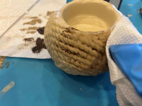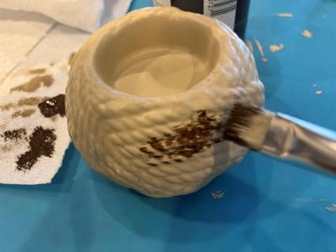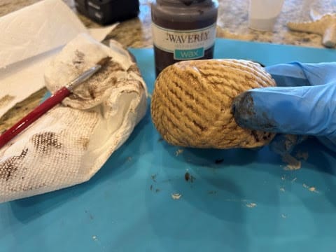 Make sure you were your latex gloves for this part or your hands will get all brown lol. I like to dampen my paintbrush for this part it is easier to apply the wax and remove if the paintbrush is damp. Dip your damp paintbrush into the Waverly antiquing wax then apply the wax to part of the rope tea light next using a paper towel remove as much wax as you like until you achieve a look you are happy with, I like to leave more of the wax in between the ropes to give them depth. Keep applying the wax and removing until you have the whole tea light holder done including the center and the bottom.