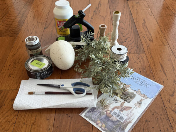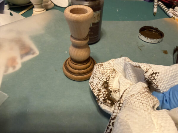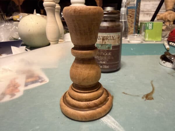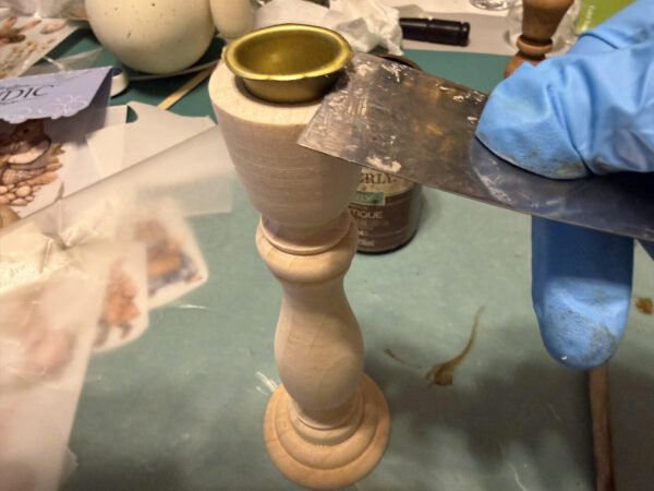 First see if your candlesticks need any sanding. My 4″ candlestick, which I had in my craft stash and the 7″ one I purchased from Hobby Lobby. If you are using the candlestick from Hobby Lobby, you will have to remove the metal taper holder, just use a putty knife to lift and remove it.