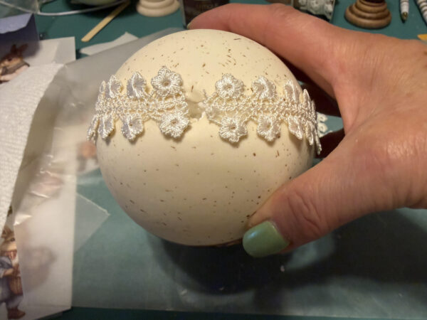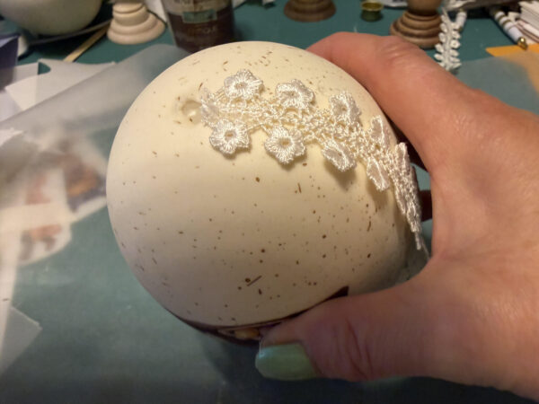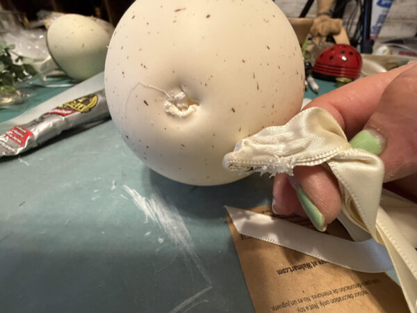 I added the ribbon to ensure my decal on the opposite side is centered. Add a small line of hot glue to the center of your ribbon then attach it to one side of the hole at the bottom of the egg.