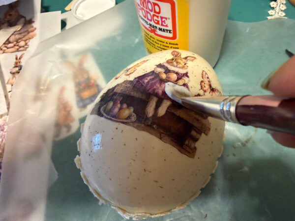 Apply a thin coat of Mod Podge over one side of the egg and let it dry. You can use a hairdryer to speed up the drying. This will seal the decal onto the egg. Repeat on the other side of the egg.