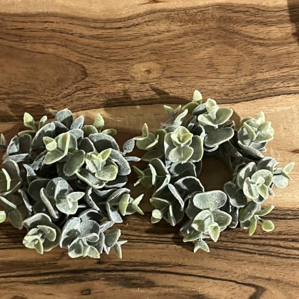 Add a touch of natural charm to your taper candles with this set of two Eucalyptus Taper Candle Rings. Made with plastic faux eucalyptus, these candle rings will add a subtle hint of greenery to your candle displays.