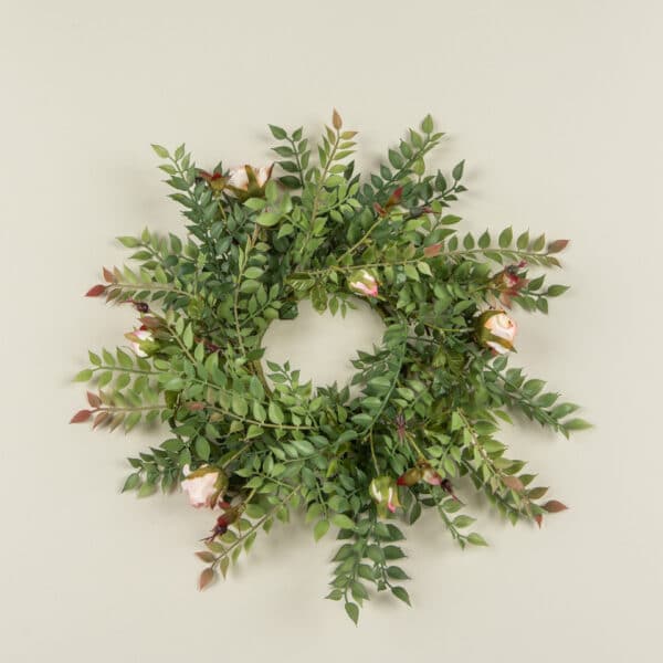 Bring a touch of garden-fresh romance to your table with this 14-inch candle ring (4-inch inner opening). A loose, natural swirl of smilax greenery forms the base—small, glossy leaves with hints of russet new growth—studded with delicate peach rosebuds caught just as they begin to open. The buds show soft peach-pink petals peeking from cream-green sepals, mixed with a few darker, spent blooms for a lived-in, realistic look.Set around a pillar candle, a hurricane, or used flat as a wreath accent, it adds quiet charm to spring brunches, Easter, Mother’s Day, showers, or everyday mantels and centerpieces. Faux materials keep it ever-blooming without water or fuss. Indoors only; spot clean as needed.