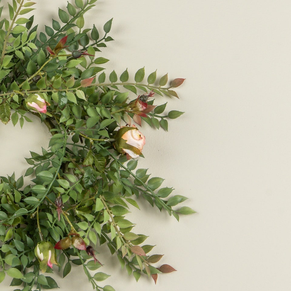- Palette: peach/blush rosebuds + green smilax with warm russet tips