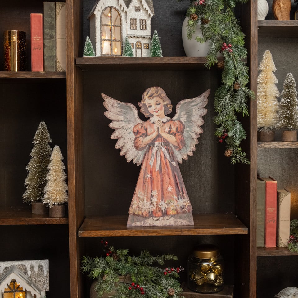 An 18″ metal Praying Angel dummy board, finished in a vintage distressed look with a coral‑red dress, white floral accents, and silver‑toned wings. The angel stands with hands clasped in prayer, adding a timeless, elegant touch to holiday or seasonal décor. Perfect for placement on a shelf, mantle, or entryway to create a charming, rustic‑chic focal point in your home styling.