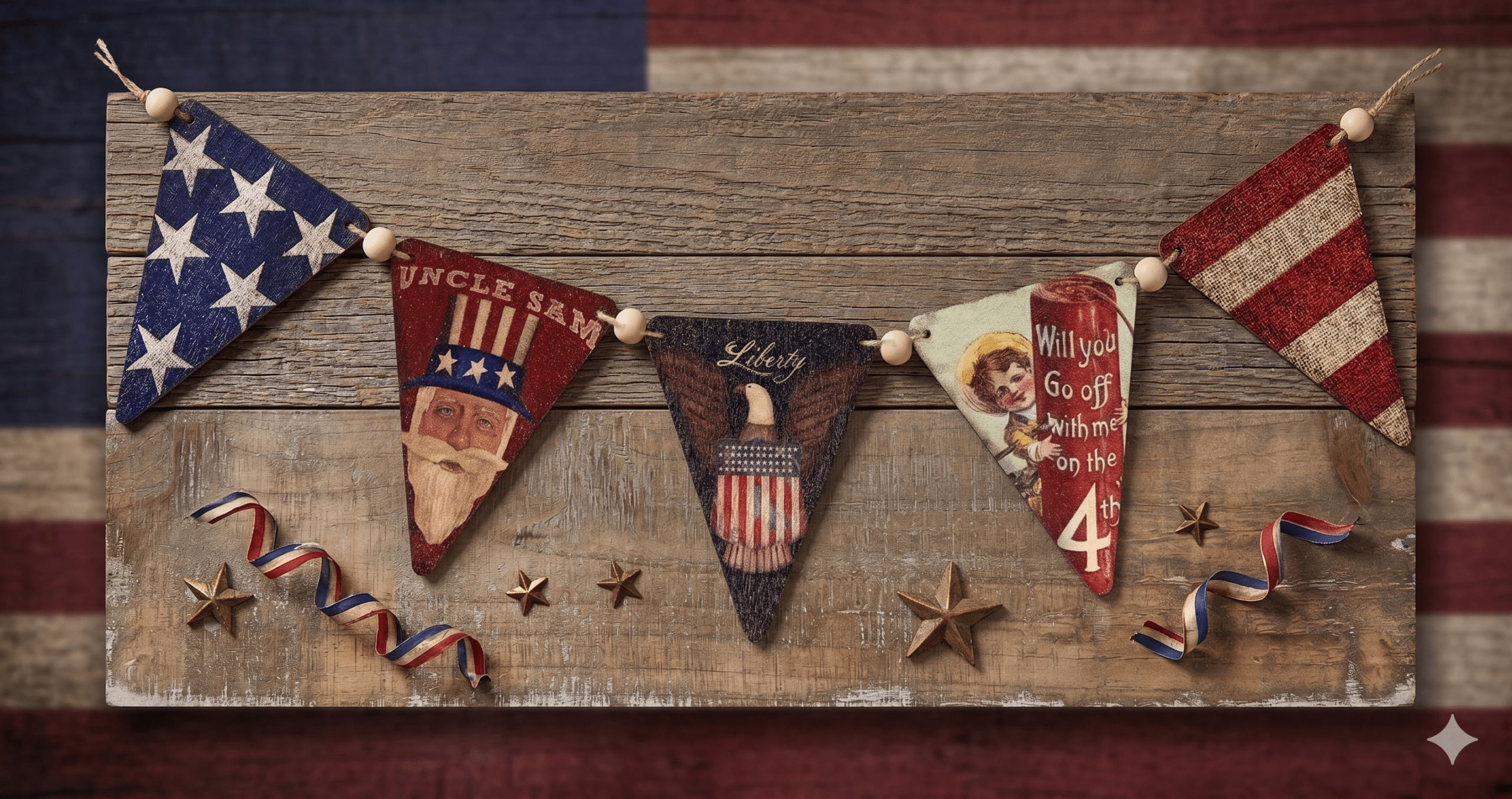 Vintage Aesthetic: Each wooden pennant showcases distressed, antique-style artwork, including Uncle Sam, the American Eagle, and commemorative July 4th motifs.