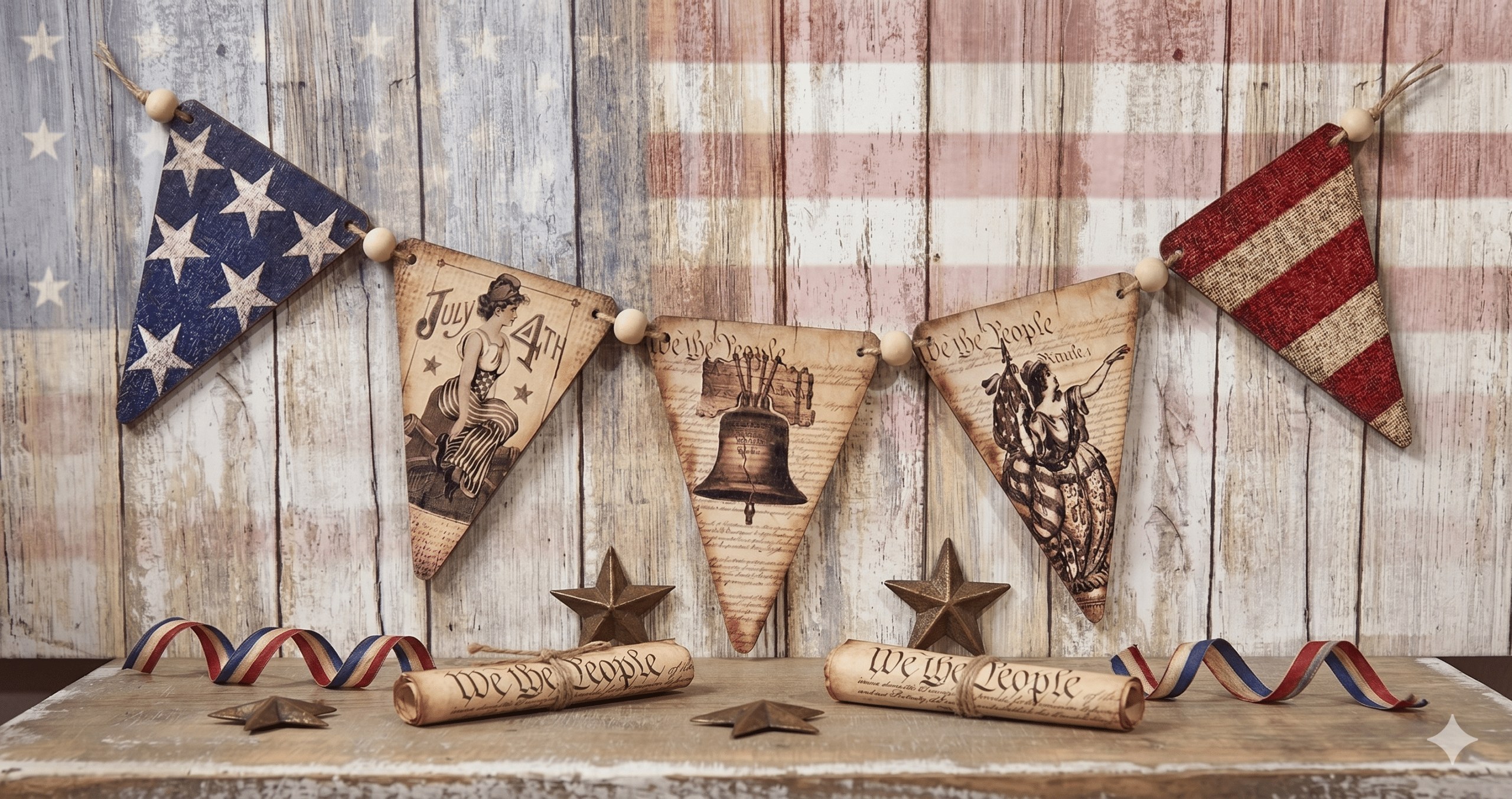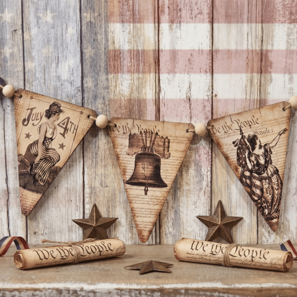 Celebrate the spirit of heritage with our Vintage Americana Bunting Banner. This charming accent piece blends rustic textures with iconic national symbols, making it the perfect year-round tribute to classic American style.