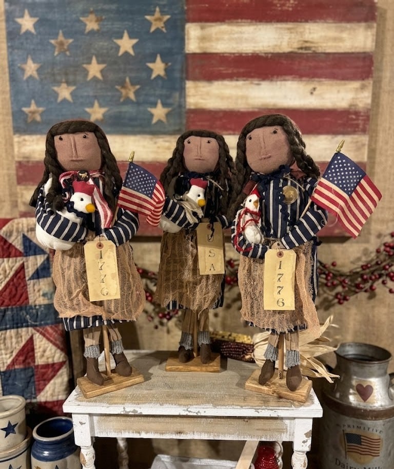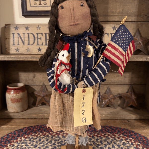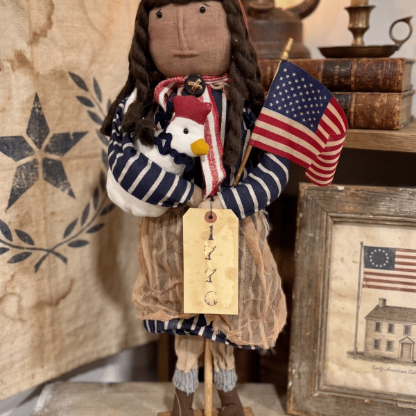 Each doll is a soulful tribute to heritage, featuring hand-dyed fabrics, tea-stained details, and a rustic aesthetic that feels like a treasured find from a colonial attic. Whether guarding a hearth or gracing a bookshelf, they bring a warm, patriotic presence to any home.