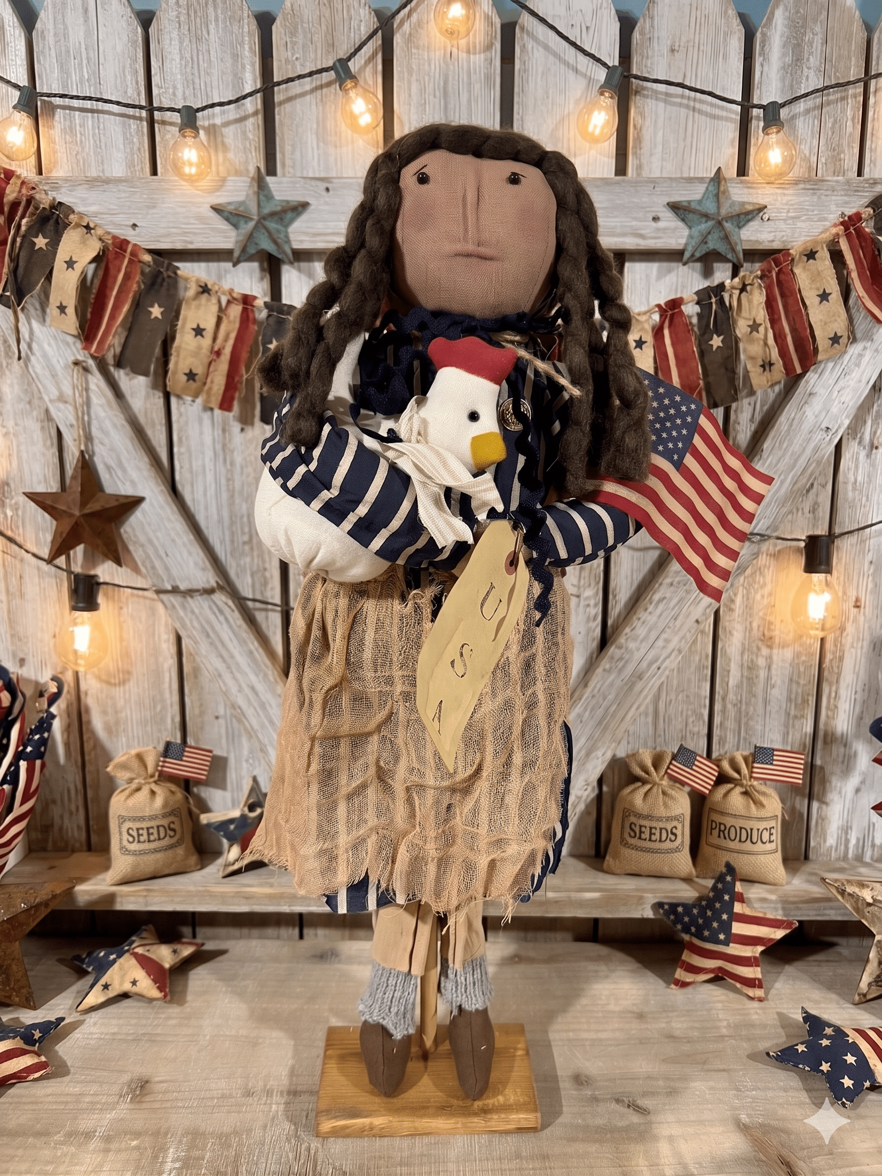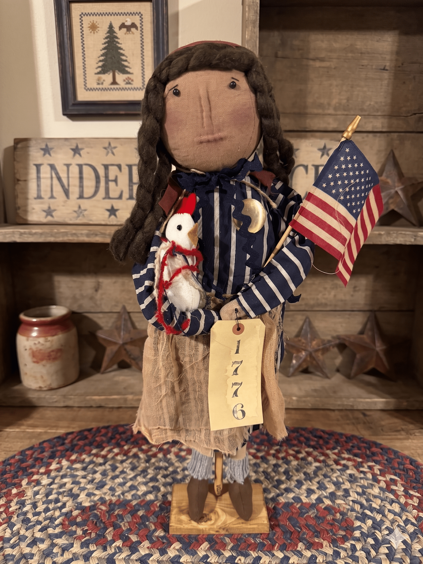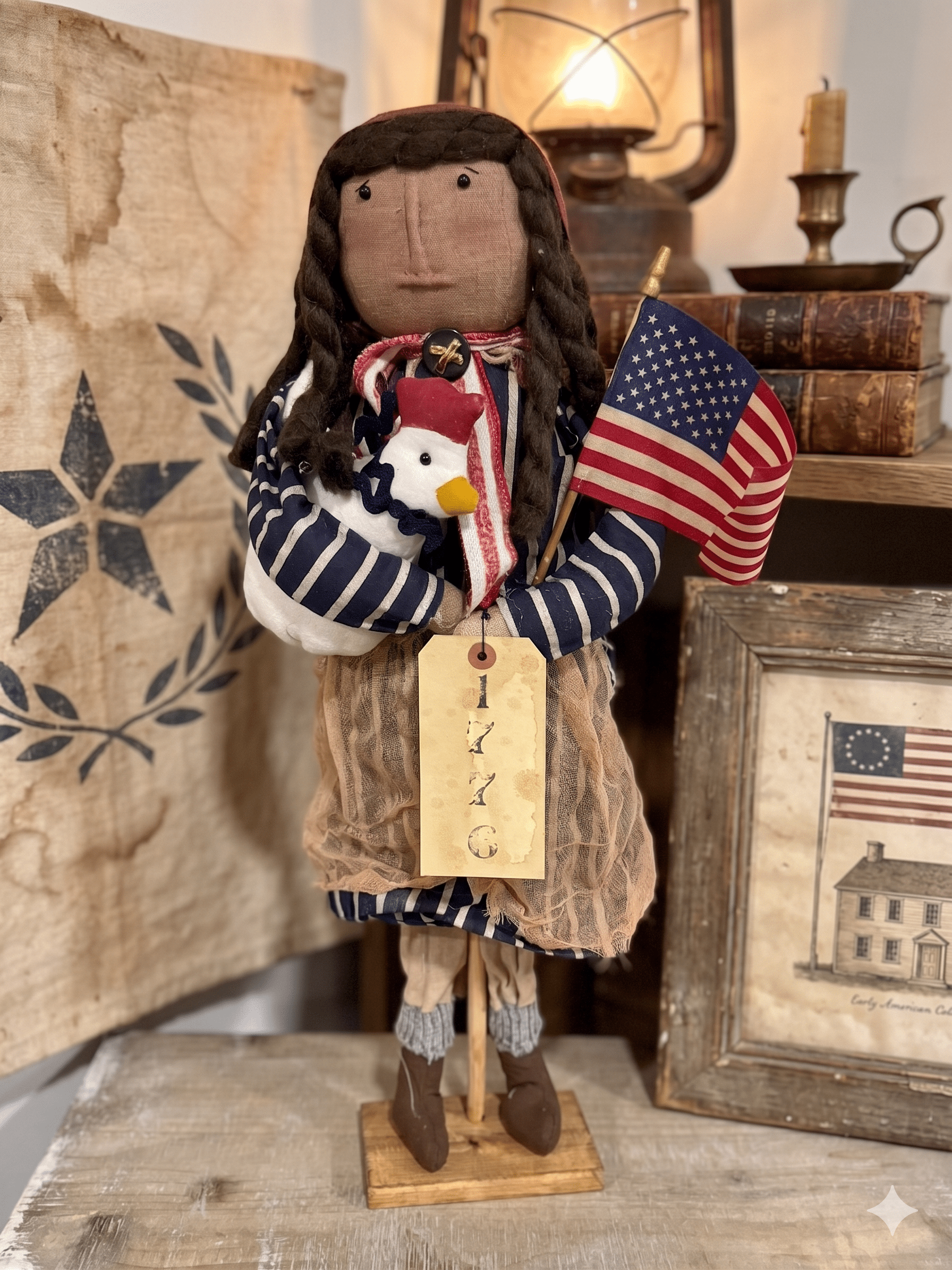 | Betsy | Highlights include a structured display on her wooden stand, a small gold pin , tea stained USA tag and a perfectly poised patriotic flag. |