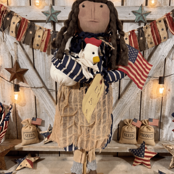 Capture the spirit of early Americana with our Vintage Liberty Dolls. Standing a proud 25″ tall on a sturdy wooden base, these heirloom-quality dolls are meticulously handcrafted to evoke the “primitive” folk art style of the 18th century.