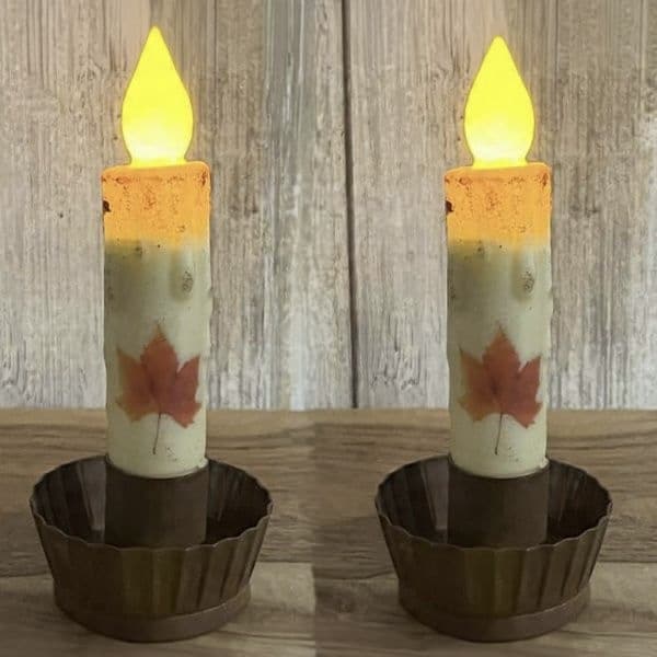These tapers are waxed dipped with a burnt orange maple leaf in the center of the taper and has a timer. The timer function will start on its own once one “AA” battery (not included) is inserted.