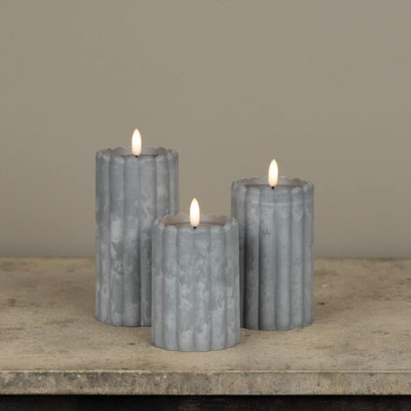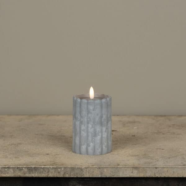 Elevate your outdoor ambiance with the perfect blend of modern texture and effortless technology. This 4-inch pillar candle features a sophisticated stone-grey finish and a unique ribbed column design, making it a stylish addition to any patio, garden, or poolside setting.