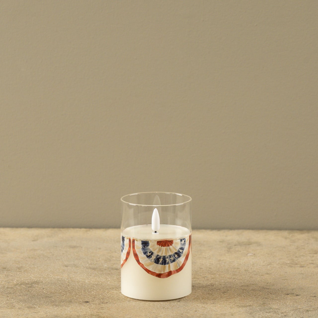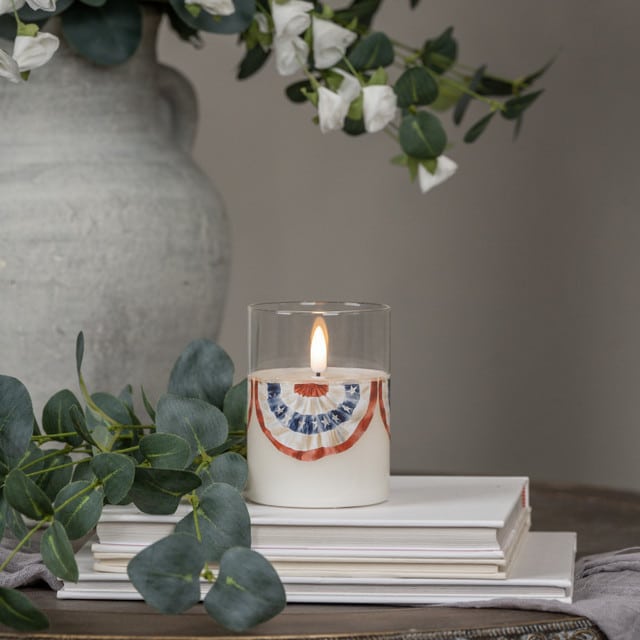 Bring a warm, nostalgic glow to your seasonal decor with this vintage-inspired flameless candle. Encased in a sleek glass cylinder, this piece features a classic Americana bunting wrap, making it an essential accent for Memorial Day, Independence Day, or year-round primitive farmhouse styling.