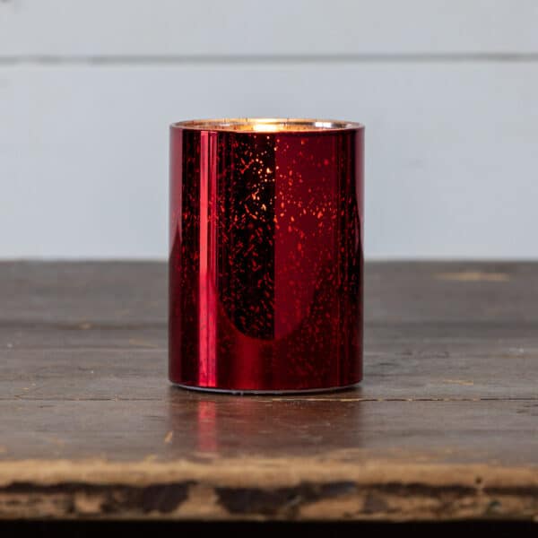 4″ Red Mercury Glass Candle Height: 4″ × Diameter: 3″ A rich red mercury-glass finish catches the light with a subtle glow, while the flameless LED design keeps things safe and mess-free. Runs on 3 AAA batteries (not included). Perfect for mantels, tables, or covered outdoor spaces where you want warm ambiance without an open flame.
