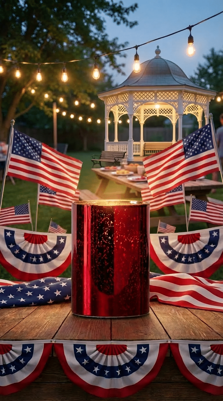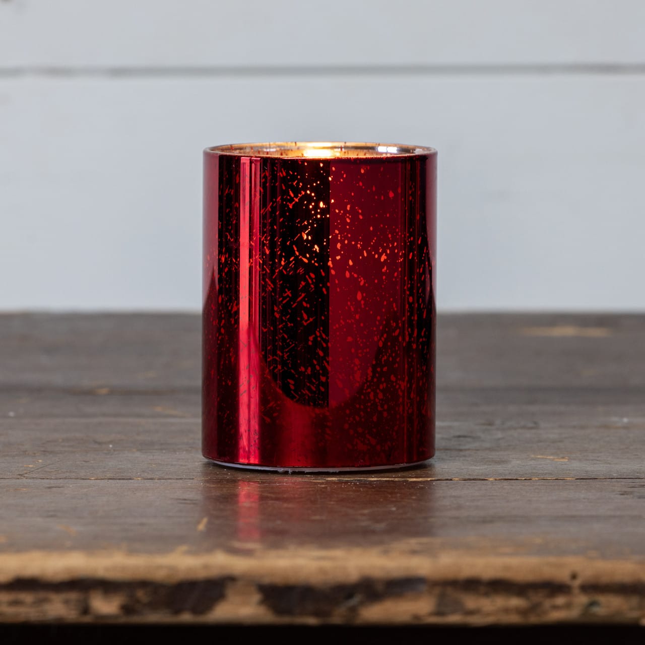 4″ Red Mercury Glass Candle Height: 4″ × Diameter: 3″ A rich red mercury-glass finish catches the light with a subtle glow, while the flameless LED design keeps things safe and mess-free. Runs on 3 AAA batteries (not included). Perfect for mantels, tables, or covered outdoor spaces where you want warm ambiance without an open flame.