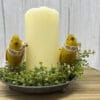 Footed candle pan is a shallow pan made of galvanized metal. It stands on three rounded feet for shelf or tabletop display and serves as a accent for pillar candles, floral rings, fillers and lights.