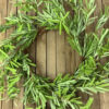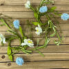 This candle ring is made of green paper wrapped floral wire with foam leaves, silk wildflowers, plastic greens and plastic hydrangeas. The candle ring would also make a beautiful mini wreath.