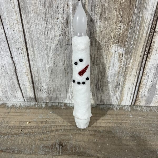 Snowman timer taper features a battery operated timer taper with a white covering with a snowman face.