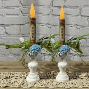 This 6” Burnt Ivory Timer Taper features the word Home on a wax dipped burnt ivory taper.