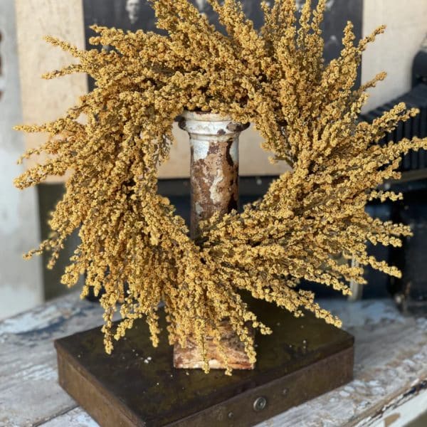 Add a beautiful touch of Fall to your decor with this Fall Heather Candle Ring. A burst of color in spire like clusters of tiny bubble berriers in a mustard color.